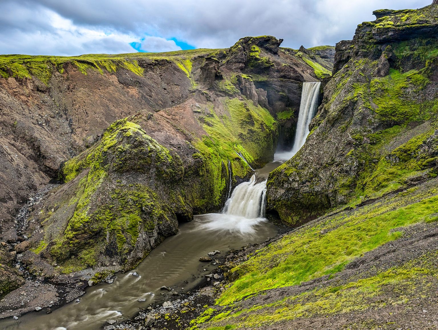 Iceland’s South Coast is waterfall country—Skógafoss alone drops 197 feet with such force that it produces permanent rainbows in the mist. On Iceland Multi-Adventure: Golden Circle & South Coast, you’ll hike 6 miles along part of Waterfall Way, passing Hestavadsfoss, Fosstorfufoss, Steinbogafoss, and several more, each with its own character. The landscape is raw: volcanic rock meeting cascading water meeting moss-covered slopes. This is nature at its most unfiltered.