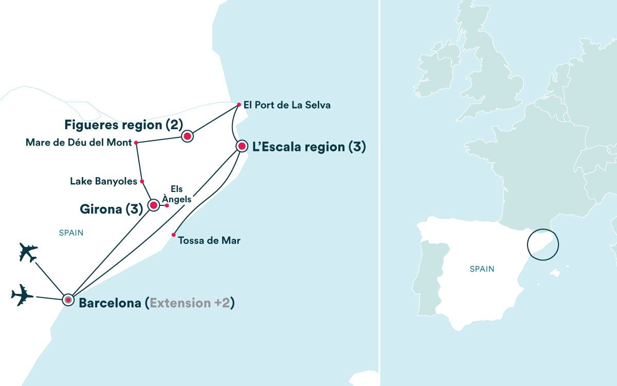 ¡Bienvenidos a España! You’ll touch down in Barcelona, then transfer to Girona, just 90 minutes north. You’ll be in the Catalonia region throughout this trip, which has two official languages—Spanish and Catalan.