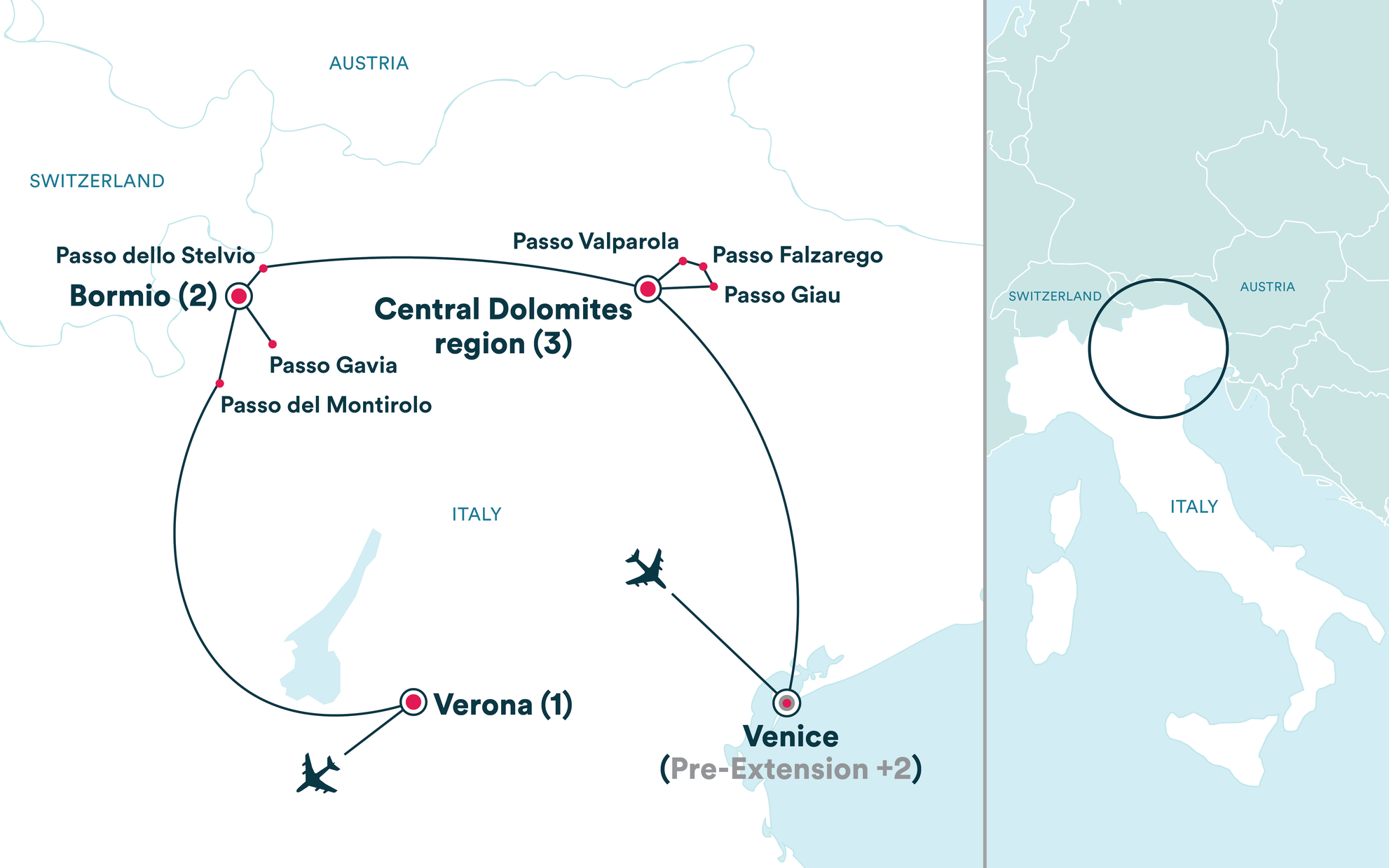 The mountains are calling! Pack your determination and cycling legs, then board your overnight flight to Italy—you’ll cross the Atlantic dreaming of towering peaks, soaring cliffs, and the iconic passes that await you.