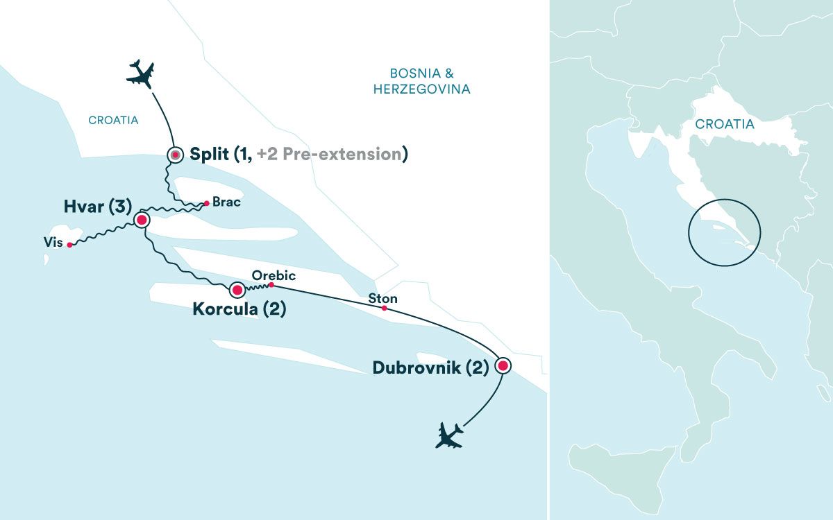- Catamaran rides from Split to Brac, Brac to Hvar, Hvar to Korcula, and Korcula to Orebic, along with other small boat rides, are included in the price of the tour.