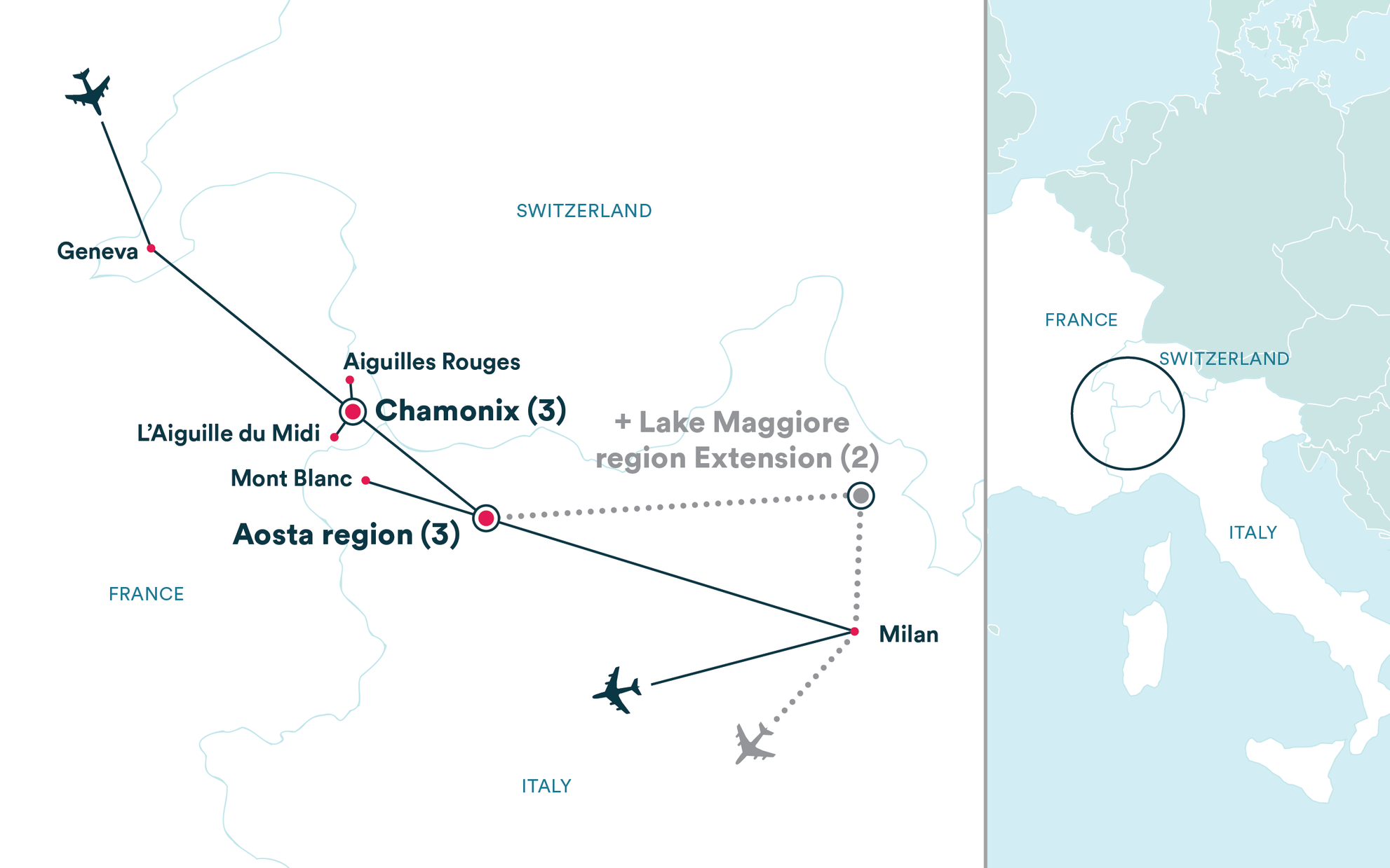 Welcome to the Alps! You’ll touch down in Geneva before transferring to your first hotel in Chamonix, France. This legendary valley—cradled between the towering peaks of the Mont Blanc Massif and the jagged Aiguilles Rouges—is where the very concept of climbing mountains for sport was born, making it the perfect launchpad for your own alpine adventure.